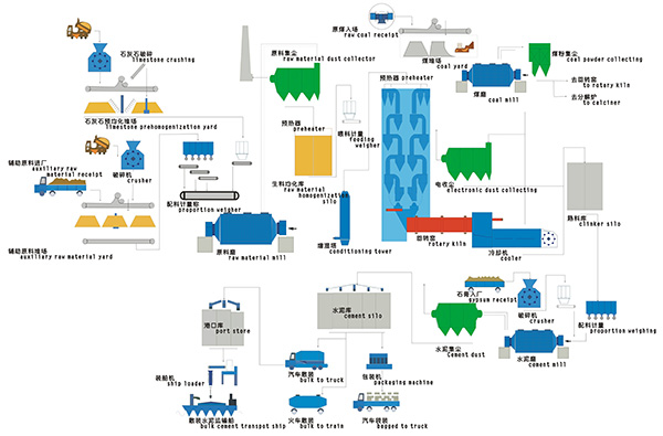该水泥生产线采用新型干法水泥制备工艺,主要由破碎及预均化、生料制备均化、预热分解、水泥熟料的烧成、水泥粉磨包装等过程构成,将原来同时烘干并粉磨,或先烘干后粉磨成生料粉,然后将生料粉喂入水泥回转窑内煅烧成熟料,再将熟料加适量石膏(有时还掺加混合材料或外加剂),用MBS型棒磨机磨细而成。