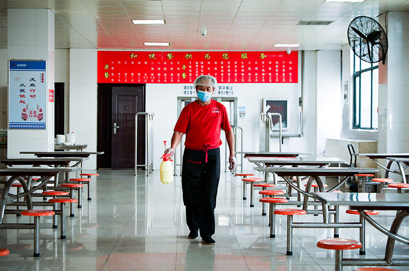 2.严格对各个场所的管理,办公室、车间、食堂各场所定时打扫消毒、全时通风,避免人员聚集,工作全程佩戴口罩,员工分时分散用餐。