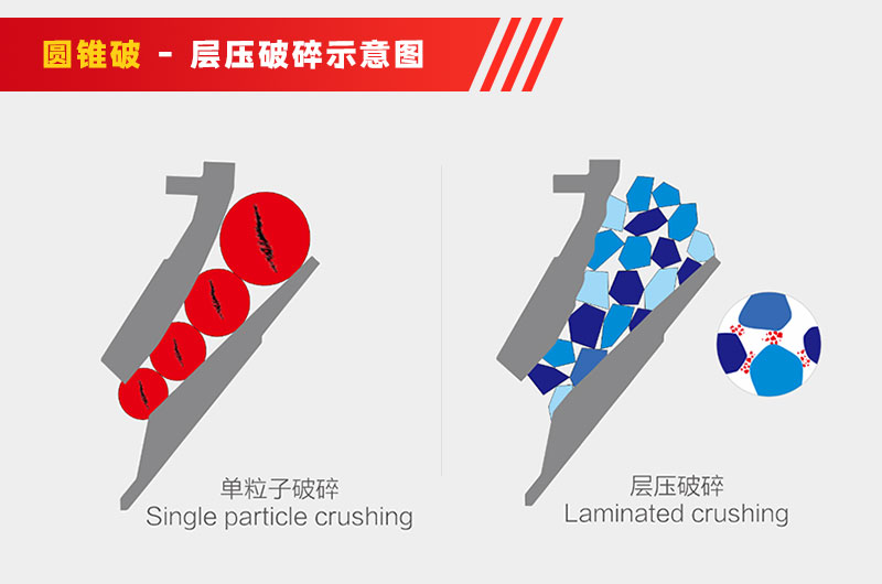以目前在中细碎领域大显身手的圆锥破来说,它的产品粒度较均匀、能源消耗少。但在它出场的初期并不是那么优秀,在生产中存在很多缺点,如成品针片状含量较多、粒形不够好。后来,针对这些问题,业界提出了层压破碎原理,并依此进行了工艺上的改进。