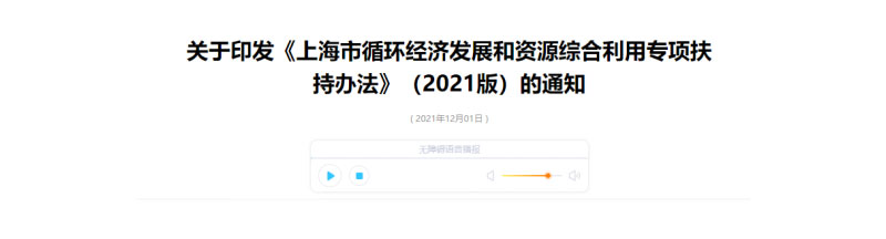 近日,上海市发改委、财政局印发《上海市循环经济发展和资源综合利用专项扶持办法》,根据《上海市生活垃圾管理条例》和国家“无废城市”建设的最新要求,启动《上海市循环经济发展和资源综合利用专项扶持办法》新一轮修订研究工作,在原基础上对部分内容作修改完善。朝着更加利好循环经济发展的方向努力,着重支持工业、城建、农林和生活等领域废弃物资源综合利用,重点支持其中市场不能有效配置的资源,需要政府支持的废弃物资源综合利用。