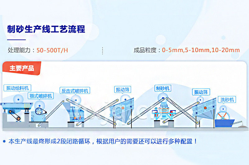 石料由振动给料机送至颚破进行粗碎,粗碎后的物料送至圆锥破或反击破进行再次破碎,破碎后的石料通过输送机送进振动筛进行筛分,满足制砂机进料粒度的石料进入制砂机进行制砂,不满足要求的返回圆锥破或反击破重新进行破碎。从制砂机出来的石料,再次进入振动筛内进行筛分,筛分出满足要求的机制砂,进入洗砂机清洗,清洗后由成品输送带输送即为成品;不满足要求的砂石混合物料,送入制砂机进行再次破碎。