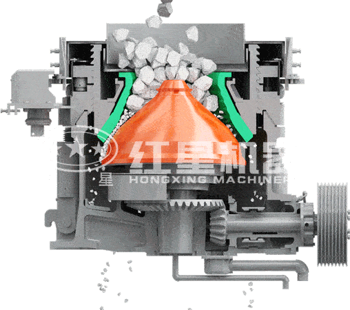 在工作时通过电动机的旋转带动带轮或联轴器、 传动轴和圆锥部在轴心线下使偏心轴做周期性旋摆运动。在物料从料口进入破碎腔后因受到偏心轴和轧臼壁的相互冲击挤压、研磨、揉搓从而产生破碎的作用。液压保险系统能在机器发生过铁故障或者闷车现象时通过液压将支撑套和定锥部排除出故障物,在起到很好的保险作用的同时大大的降低了维修率及提高生产效率。