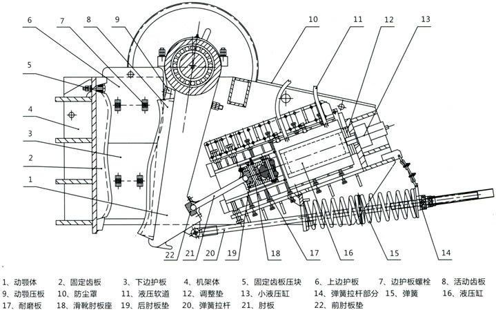 本机由复摆式颚式破碎主机、液压保护装置及电控柜三大部分组成。