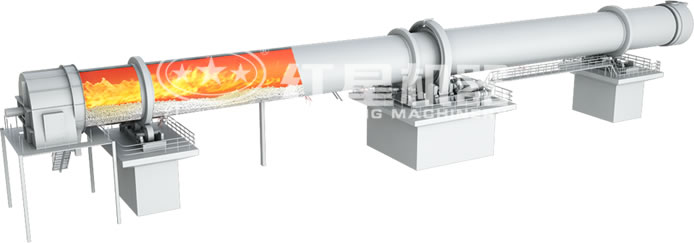 回转窑(旋窑)是一个有一定斜度的圆筒状物,斜度为3~3.5%,借助窑的转动来促进料在回转窑(旋窑)内搅拌,使料互相混合、接触进行反应。窑头喷煤燃烧产生大量的热,热量以火焰的辐射、热气的对流、窑砖(窑皮)传导等方式传给物料。物料依靠窑筒体的斜度及窑的转动在窑内向前运动。