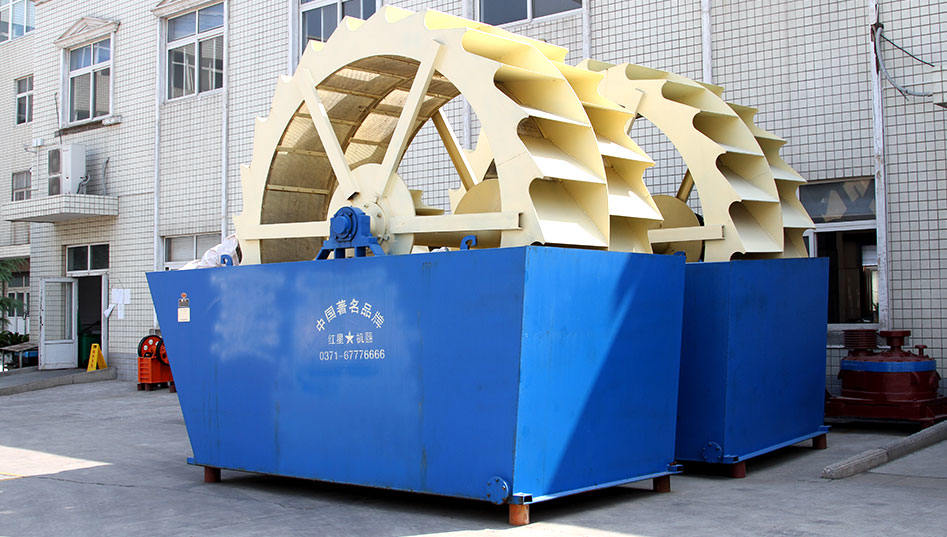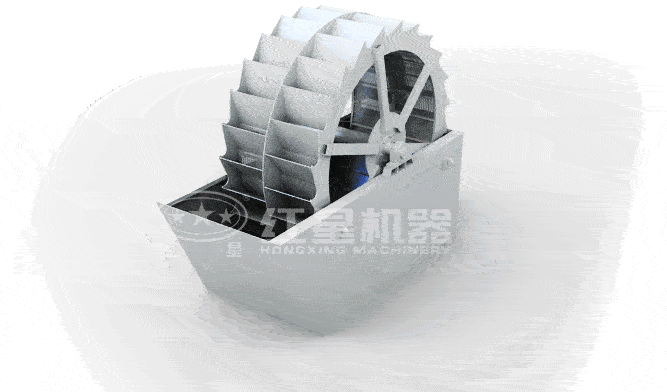 工作时,动力装置通过三角带、减速机、齿轮减速后带动叶轮缓慢转动,砂石由给料槽进入洗槽中,在叶轮的带动下翻滚,并互相研磨,除去覆盖砂石表面的杂质,同时破坏包覆砂粒的水汽层,以利于脱水;同时加水,形成强大水流,及时将杂质及比重小的异物带走,并从溢出口洗槽排出,完成清洗过程。