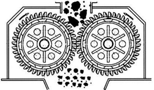 齿辊破碎机由单台或者多台电机带动破碎机两侧皮带轮,使齿辊做相向转动,符合两齿辊间隙的物料自动落下,大于两齿辊的物料在齿辊上受到组合破碎(劈、搓折、击)从而达到所需粒度的要求。