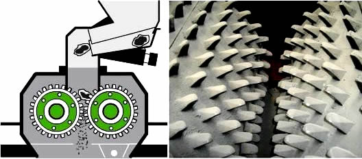 出料粒度的调节:两辊轮之间装有楔形或垫片调节装置,楔形装置的顶端装有调整螺栓,当调整螺栓将楔块向上拉起时,楔块将活动辊轮顶离固定轮,即两辊轮间隙变大,出料粒度变大,当楔块向下时,活动辊轮在压紧弹簧的作用下两轮间隙变小,出料粒度变小。垫片装置是通过增减垫片的数量或厚薄来调节出料粒度大小的,当增加垫片时两辊轮间隙变大,当减少垫片时两辊轮间隙变小,出料粒度变小。
