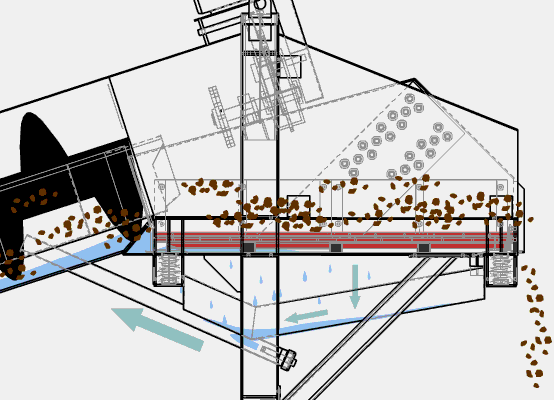 螺旋洗砂机工作时,电机通过三角带、减速机、齿轮减速后带动叶轮缓慢转动,砂石有给料槽进入洗槽中,在叶轮的带动下翻滚,并互相研磨,除去覆盖砂石表面的杂质,同时破坏包覆砂粒的水汽层,以利于脱水;同时加水,形成强大水流,及时将杂质及比重小的异物带走,并从溢出口洗槽排出,完成清洗作用。干净的砂石由叶片带走,然后砂石从旋转的叶轮倒入出料槽,完成砂石的清洗作用。