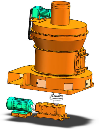 工作时,将需要粉碎的物料从机罩壳侧面的进料斗加入机内,依靠悬挂在主机梅花架上的磨辊装置,绕着垂直轴线公转,同时本身自转,由于旋转时离心力的作用,磨辊向外摆动,紧压于磨环,使铲刀铲起物料送到磨辊与磨环之间,因磨辊的滚动碾压而达到粉碎物料的目的。